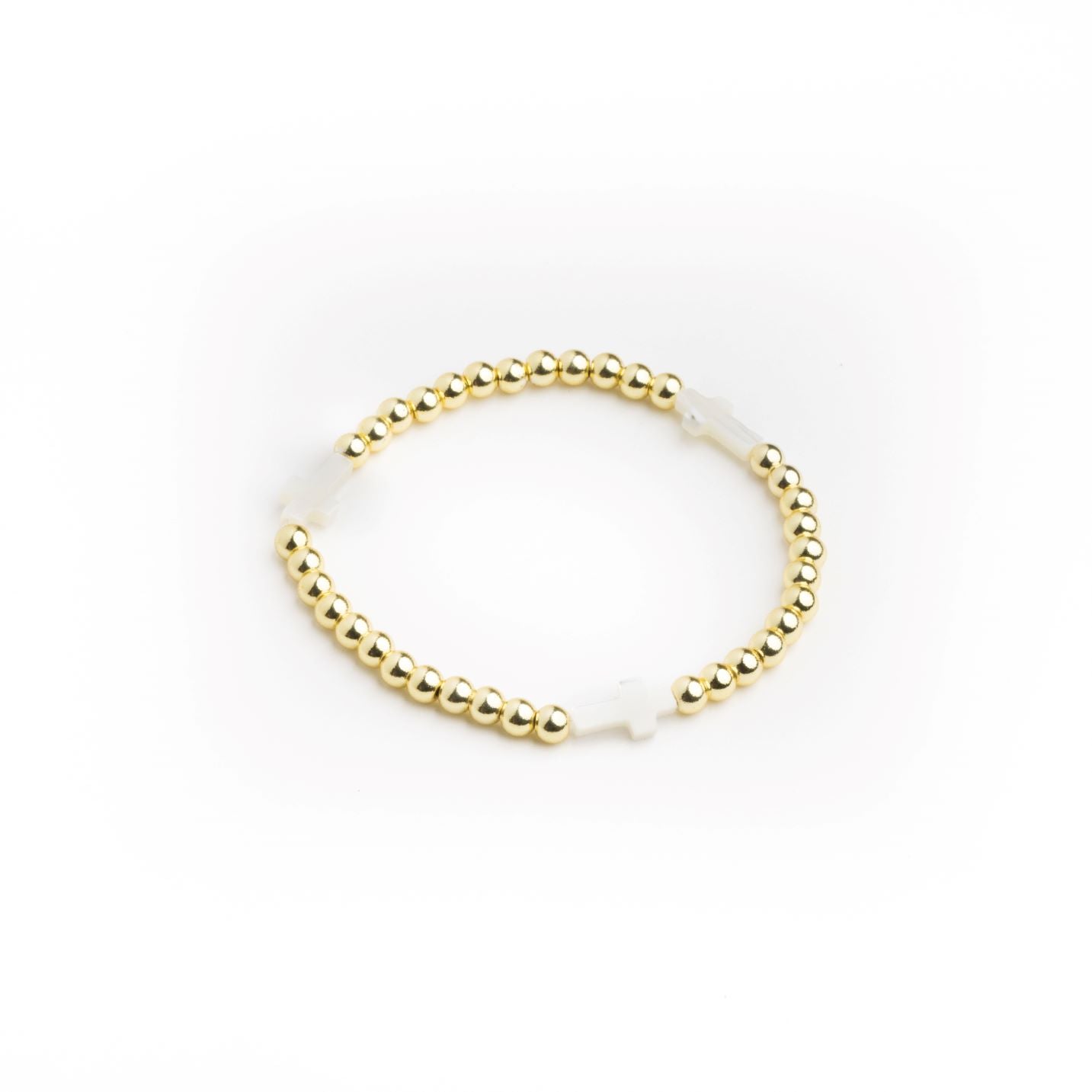 Our latest design! Sweet Mother of Pearl Cross and 4mm gold bead bracelet. Stackable with all of your favorites.